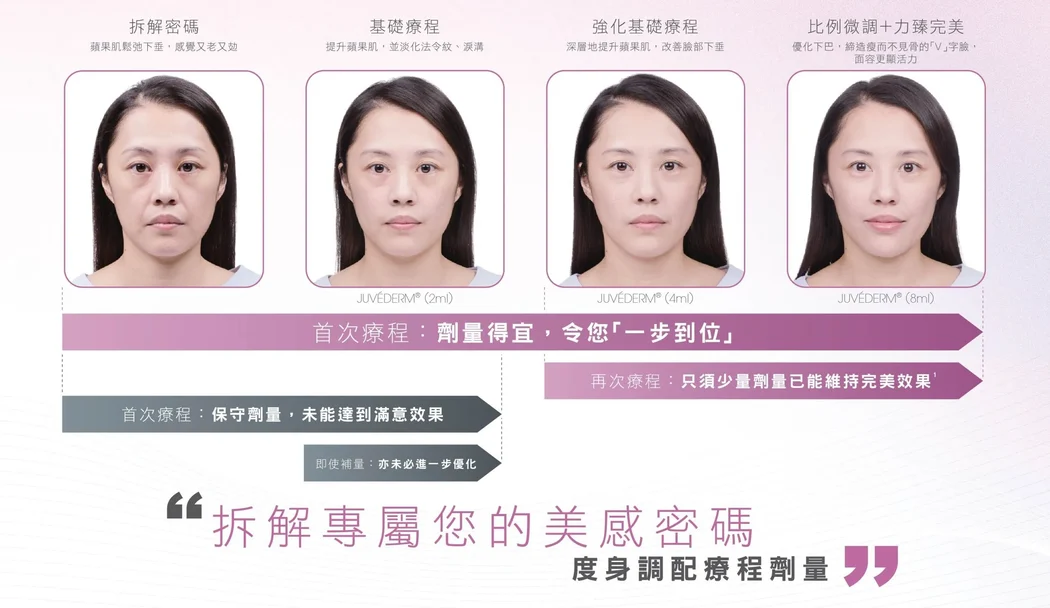 透過 Juvederm 最新美感密碼療程,達到全面協調效果,立即消除皺紋、優化臉部輪廓、提升鬆弛面頰、改善膚質及回復豐盈飽滿肌膚,助你重拾年輕活力。