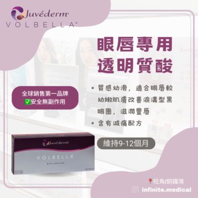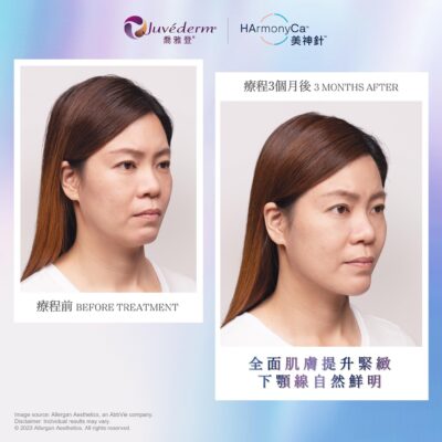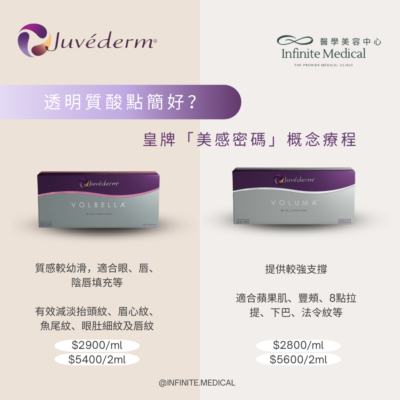 同時,JUVÉDERM®的透明質酸,屬於大份子透明質酸,質感柔順平滑,有效鎖住水份保濕皮膚,增加皮膚密度,改善質感,一次療程可以瞬間令你回復美麗自信。