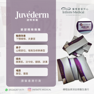 隨住年紀漸長,面部肌膚老化及膠原流失,造成太陽穴凹陷、蘋果肌扁平、虎紋木偶紋出現,個樣望落去十分顯老。想捉住年輕,keep住自己望落去後生5-10年,Juvederm透明質酸產品系列,可以解決你嘅煩惱。
